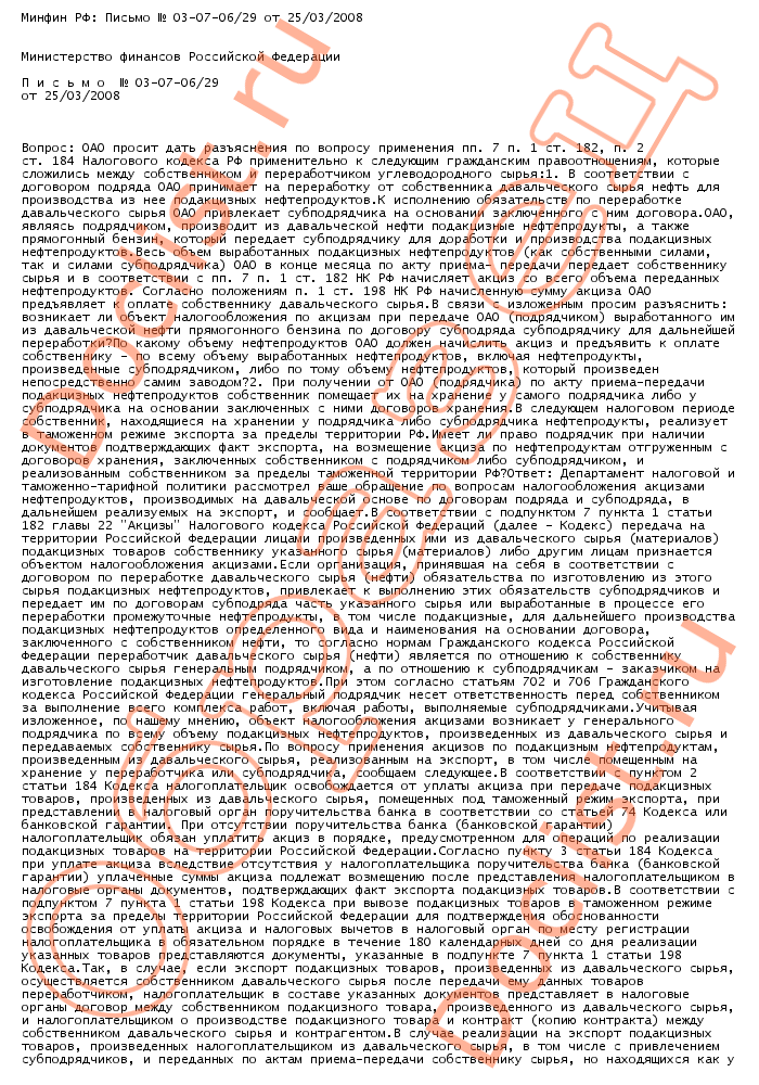 Описание: Министерство финансов Российской Федерации П и с ь м о № 03-07-06/29 от 25/03/2008 Вопрос: ОАО просит дать разъяснения по вопросу применения пп. 7 п. 1 ст. 182, п. 2 ст. 184 Налогового кодекса РФ применительно к следующим гражданским правоотношениям, которые сложились между собственником и переработчиком углеводородного сырья:1. В соответствии с договором подряда ОАО принимает на переработку от собственника давальческого сырья нефть для производства из нее...
