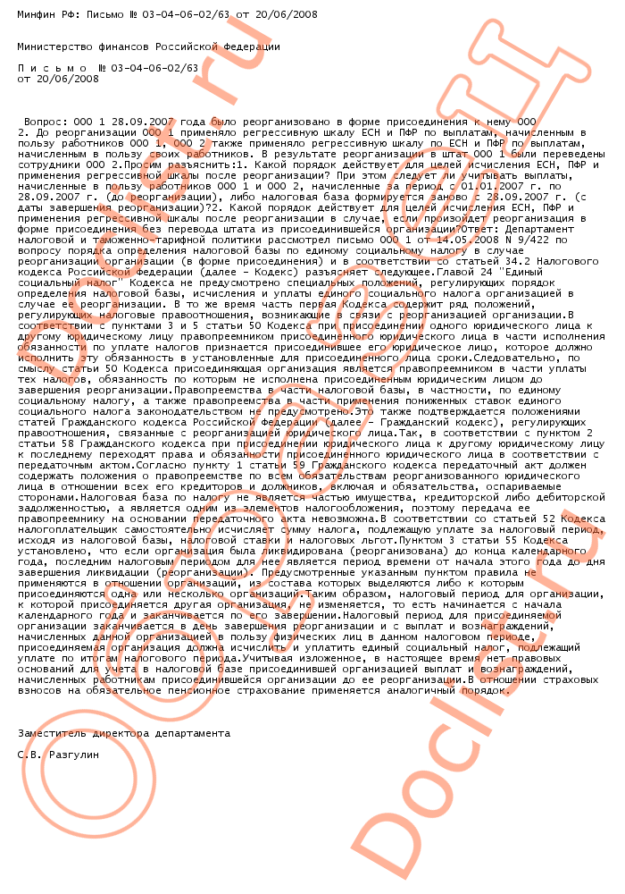 Паспорт файла Добавлен: 26.09.2008 Размер: 6.03 Кб Просмотров/Скачиваний: 464/0 Описание: Министерство финансов Российской Федерации П и с ь м о № 03-04-06-02/63 от 20/06/2008 Вопрос: ООО 1 28.09.2007 года было реорганизовано в форме присоединения к нему ООО 2. До реорганизации ООО 1 применяло регрессивную шкалу ЕСН и ПФР по выплатам, начисленным в пользу работников ООО 1, ООО 2 также применяло регрессивную шкалу по ЕСН и ПФР по выплатам, начисленным в пользу своих работников. В результате реорганизации в штат ООО 1 были переведены сотрудники ООО 2.Просим...