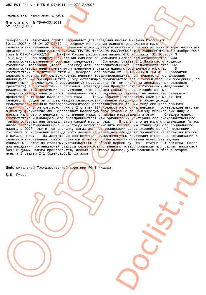 ФНС РФ: Письмо № ГВ-6-05/1011 от 27/12/2007 скачать образец документа