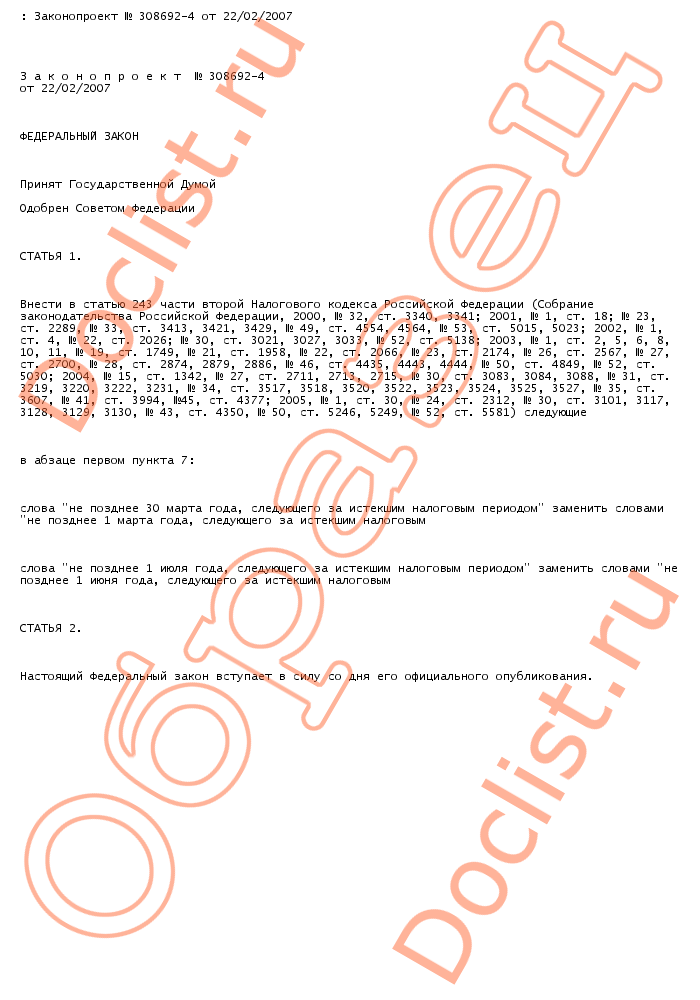Паспорт файла Добавлен: 25.09.2008 Размер: 2.27 Кб Просмотров/Скачиваний: 330/0 Описание: З а к о н о п р о е к т № 308692-4 от 22/02/2007 ФЕДЕРАЛЬНЫЙ ЗАКОН Принят Государственной Думой Одобрен Советом Федерации СТАТЬЯ 1. Внести в статью 243 части второй Налогового кодекса Российской Федерации (Собрание законодательства Российской Федерации, 2000, № 32, ст. 3340, 3341; 2001, № 1, ст. 18; № 23, ст. 2289, № 33, ст. 3413, 3421, 3429, № 49, ст. 4554, 4564, № 53, ст. 5015, 5023; 2002, № 1, ст. 4, № 22, ст. 2026; № 30, ст. 3021, 3027, 3033, № 52, ст. 5138; 2003, № 1, ст. 2, 5,...