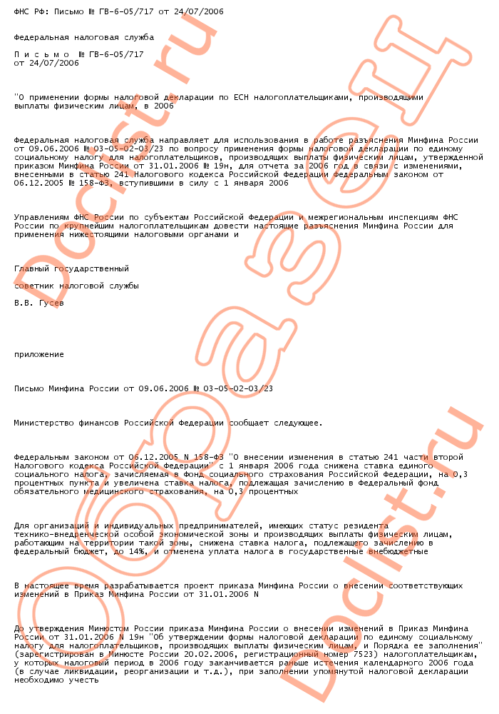 Паспорт файла Добавлен: 26.09.2008 Размер: 4.11 Кб Просмотров/Скачиваний: 441/0 Описание: Федеральная налоговая служба П и с ь м о № ГВ-6-05/717 от 24/07/2006 "О применении формы налоговой декларации по ЕСН налогоплательщиками, производящими выплаты физическим лицам, в 2006 году" Федеральная налоговая служба направляет для использования в работе разъяснения Минфина России от 09.06.2006 № 03-05-02-03/23 по вопросу применения формы налоговой декларации по единому социальному налогу для налогоплательщиков, производящих выплаты физическим лицам, утвержденной приказом Минфина...