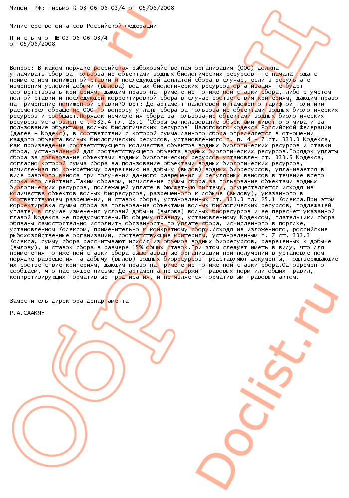 Описание: Министерство финансов Российской Федерации П и с ь м о № 03-06-06-03/4 от 05/06/2008 Вопрос: В каком порядке российская рыбохозяйственная организация (ООО) должна уплачивать сбор за пользование объектами водных биологических ресурсов - с начала года с применением пониженной ставки и последующей доплатой сбора в случае, если в результате изменения условий добычи (вылова) водных биологических ресурсов организация не будет соответствовать критериям, дающим право на применение...