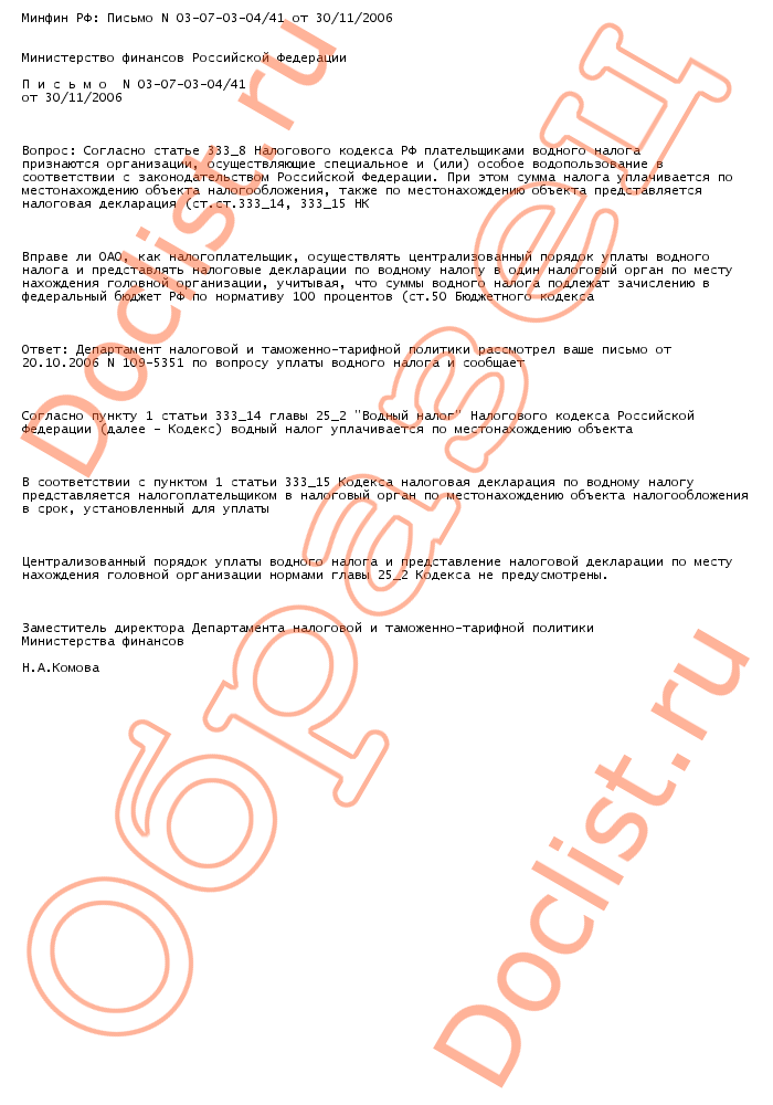 Паспорт файла Добавлен: 19.10.2008 Размер: 2.41 Кб Просмотров/Скачиваний: 480/0 Описание: Министерство финансов Российской Федерации П и с ь м о N 03-07-03-04/41 от 30/11/2006 Вопрос: Согласно статье 333_8 Налогового кодекса РФ плательщиками водного налога признаются организации, осуществляющие специальное и (или) особое водопользование в соответствии с законодательством Российской Федерации. При этом сумма налога уплачивается по местонахождению объекта налогообложения, также по местонахождению объекта представляется налоговая декларация (ст.ст.333_14, 333_15 НК РФ)....