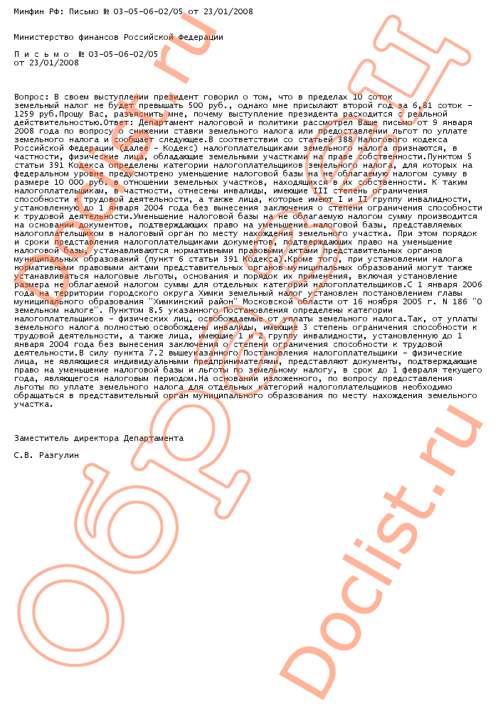 Минфин РФ: Письмо № 03-05-06-02/05 от 23/01/2008 скачать образец документа