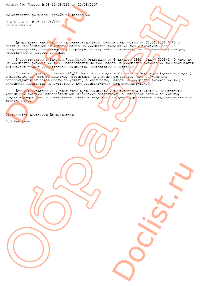 Минфин РФ: Письмо № 03-11-05/192 от 20/08/2007 скачать образец документа