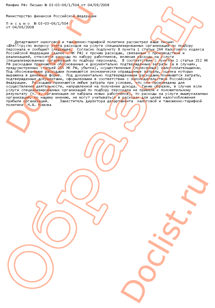 Минфин РФ: Письмо № 03-03-06/1/504 от 04/09/2008 скачать образец документа