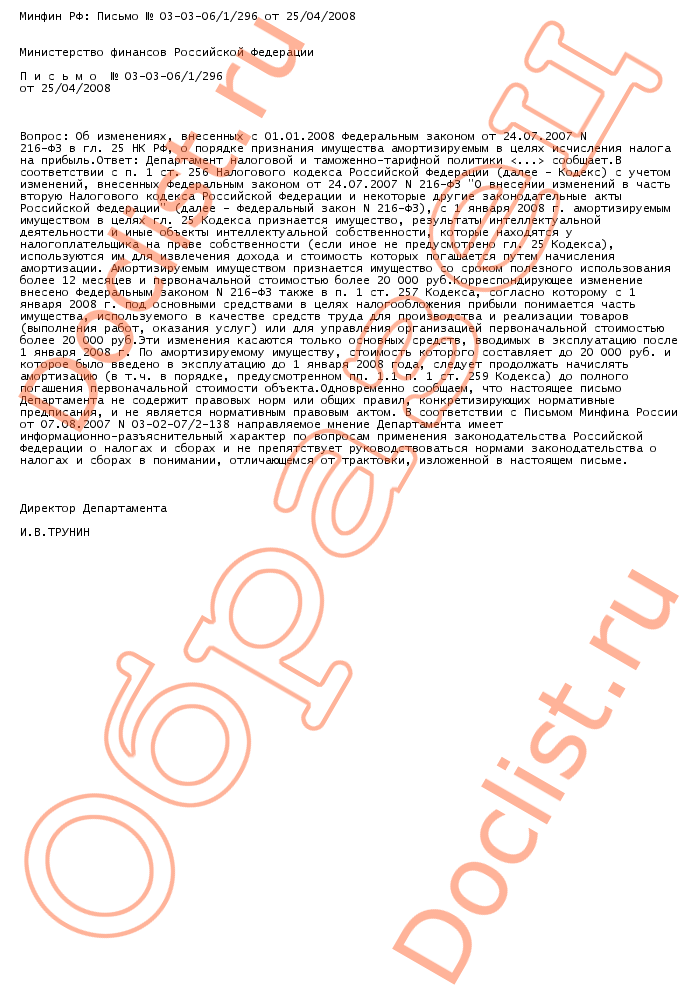 Минфин РФ: Письмо № 03-03-06/1/296 от 25/04/2008 скачать образец документа