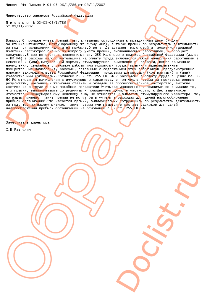 Минфин РФ: Письмо № 03-03-06/1/786 от 09/11/2007 скачать образец документа