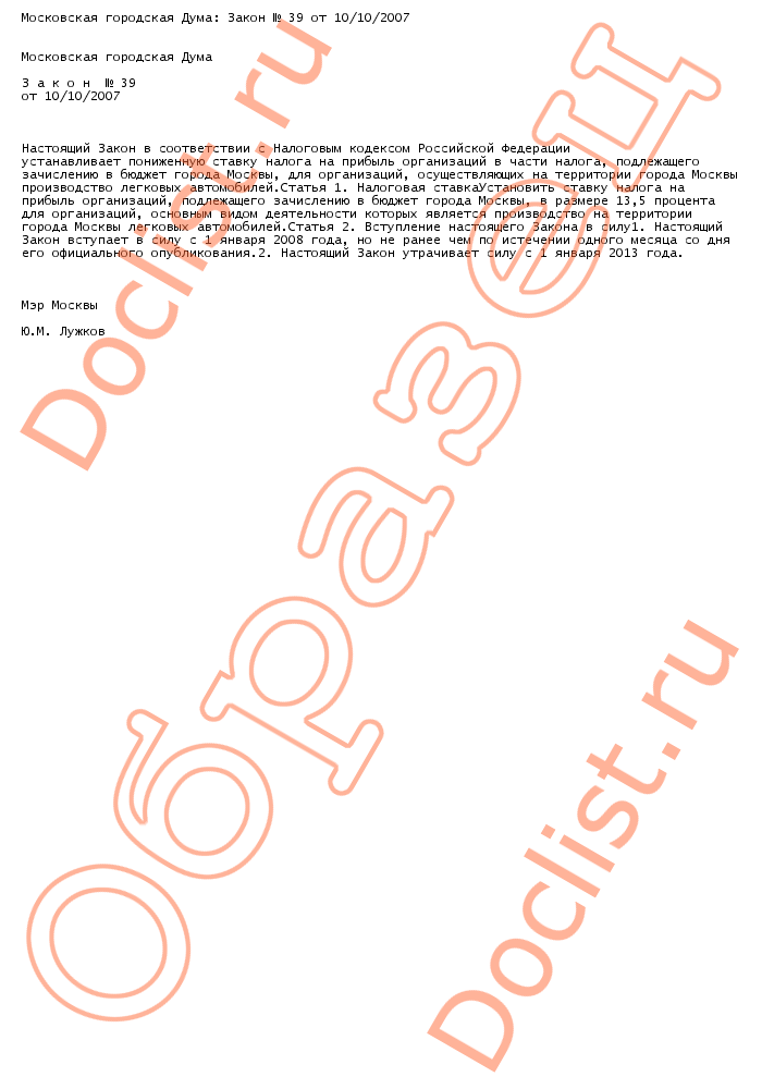Московская городская Дума: Закон № 39 от 10/10/2007 скачать образец документа