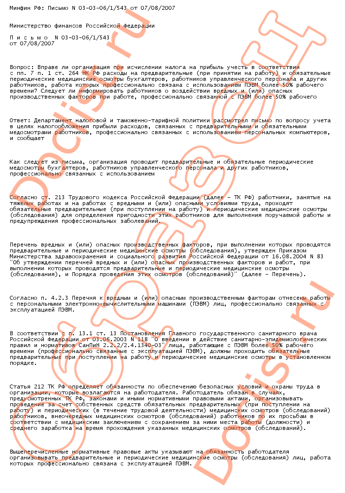 Минфин РФ: Письмо N 03-03-06/1/543 от 07/08/2007 скачать образец документа