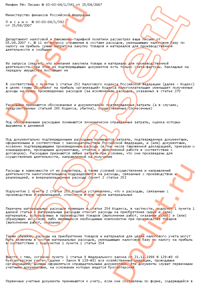 Минфин РФ: Письмо № 03-03-06/1/392 от 25/06/2007 скачать образец документа
