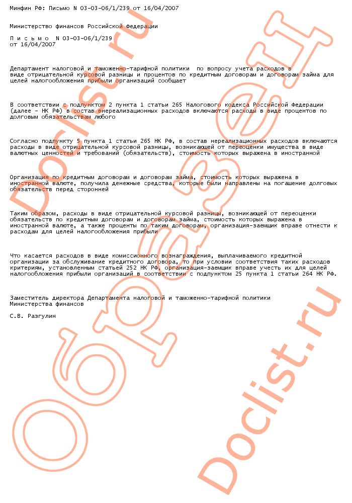 Минфин РФ: Письмо N 03-03-06/1/239 от 16/04/2007 скачать образец документа