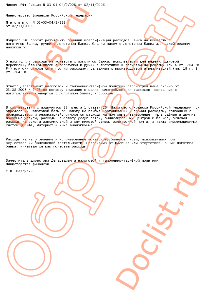Минфин РФ: Письмо N 03-03-04/2/228 от 02/11/2006 скачать образец документа