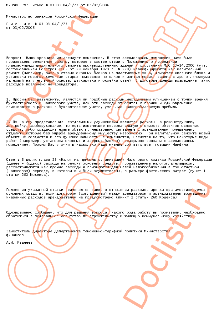 Минфин РФ: Письмо № 03-03-04/1/73 от 03/02/2006 скачать образец документа