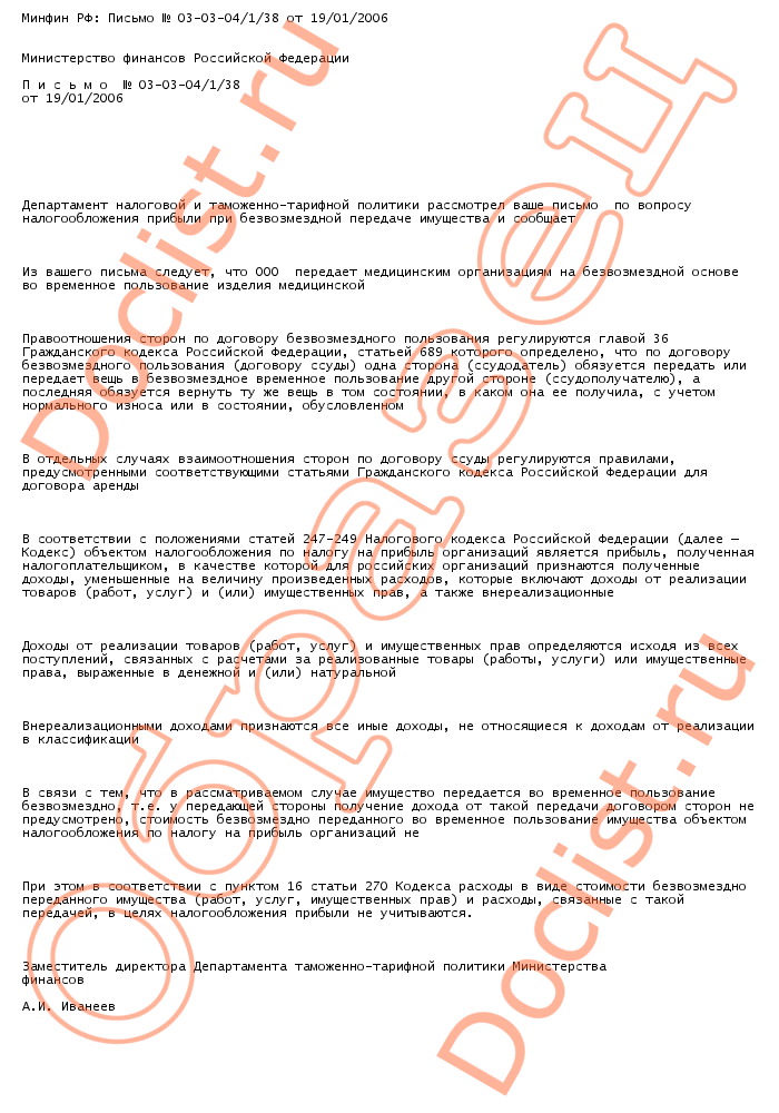 Минфин РФ: Письмо № 03-03-04/1/38 от 19/01/2006 скачать образец документа
