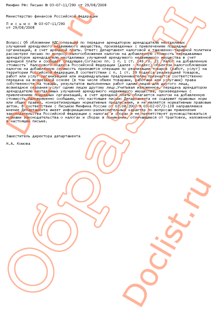 Минфин РФ: Письмо № 03-07-11/290 от 29/08/2008 скачать образец документа