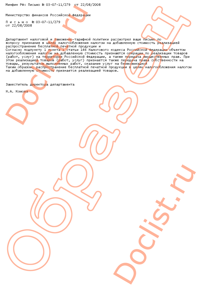 Минфин РФ: Письмо № 03-07-11/279 от 22/08/2008 скачать образец документа