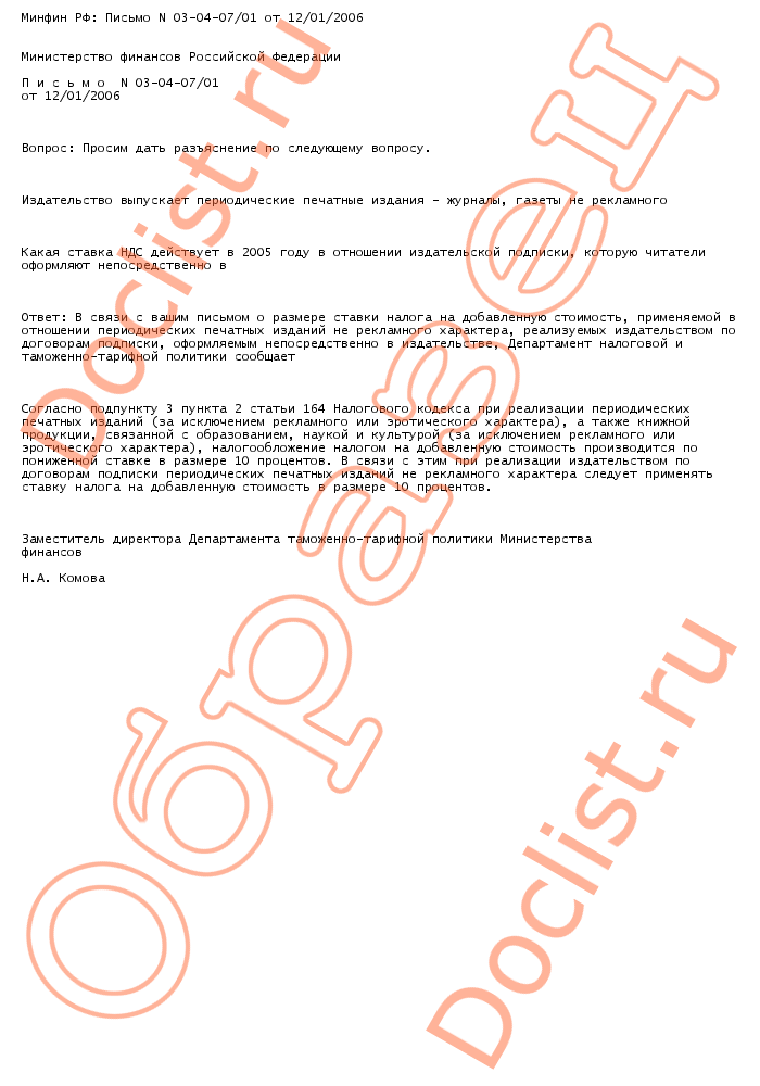 Минфин РФ: Письмо N 03-04-07/01 от 12/01/2006 скачать образец документа
