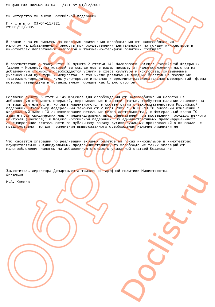 Минфин РФ: Письмо 03-04-11/321 от 01/12/2005 скачать образец документа