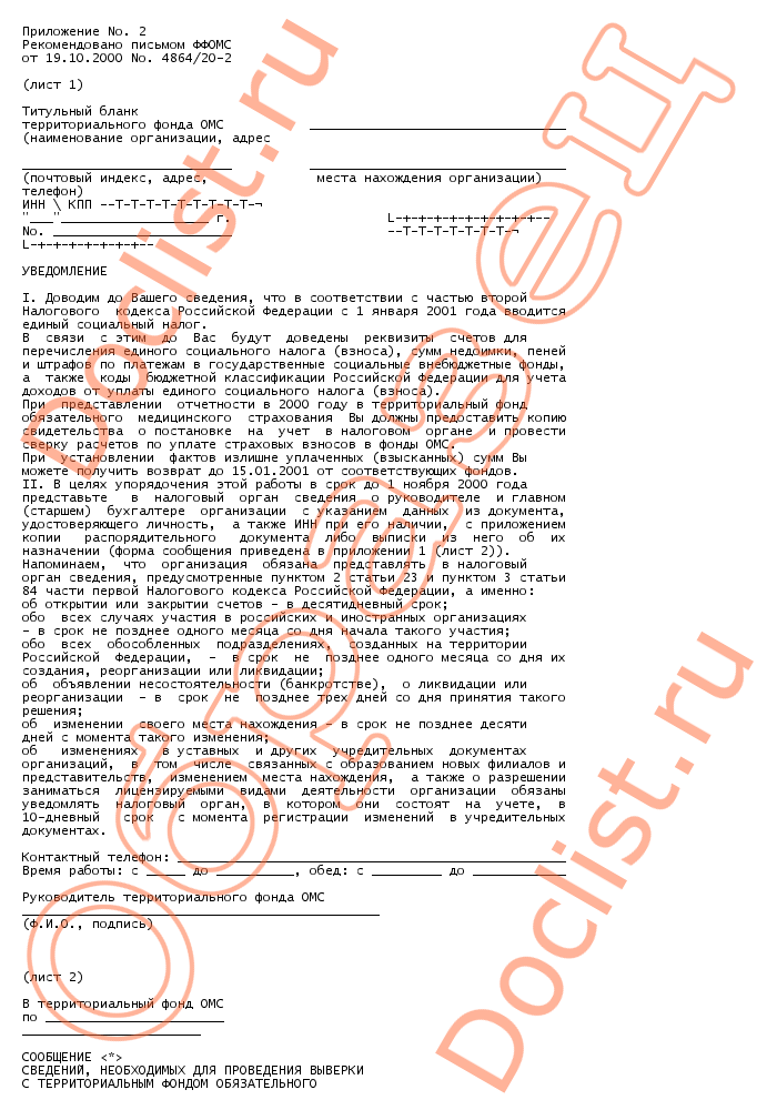 Уведомление о введении единого социального налога (лист 1). сообщение сведений, необходимых для проведения выверки с территориальным фондом обязательного медицинского страхования (лист 2) скачать образец документа