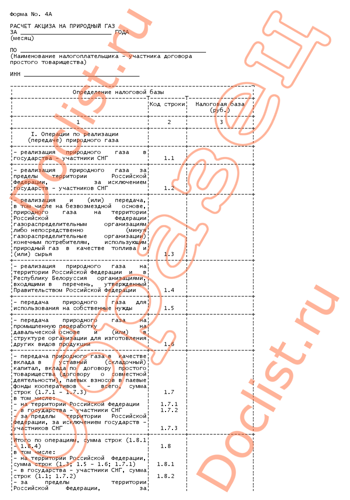 Расчет акциза на природный газ. Форма nо. 4а скачать образец документа