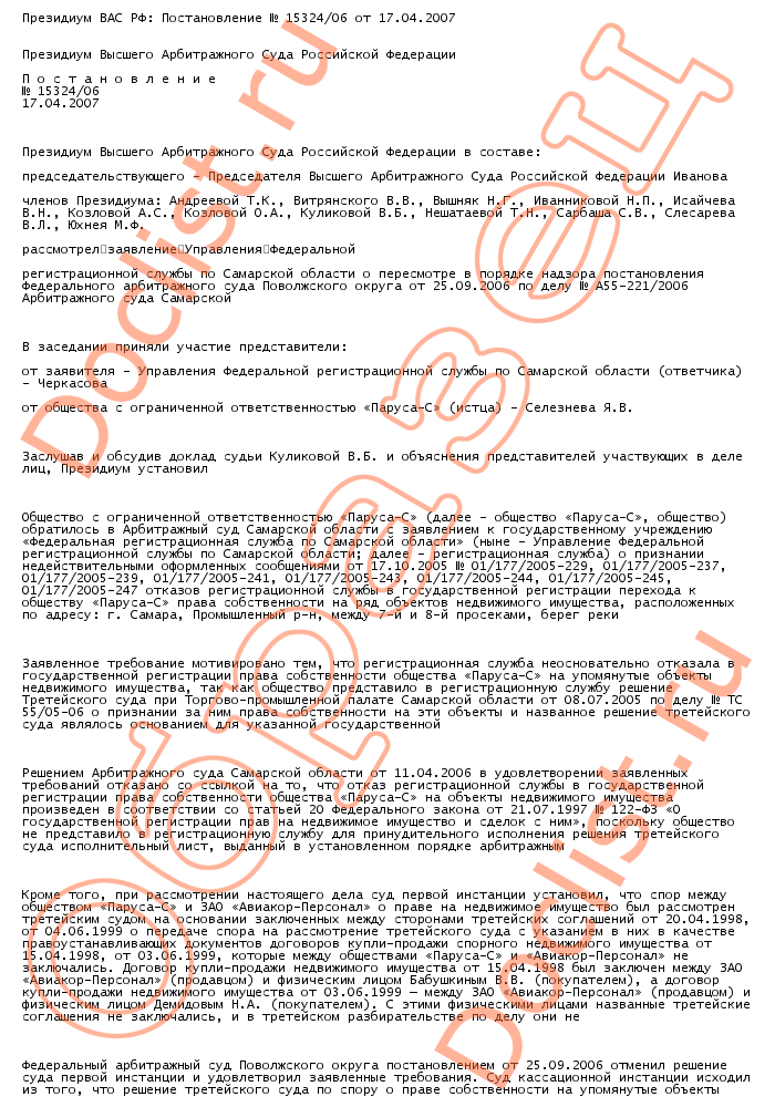 Президиум ВАС РФ: Постановление № 15324/06 от 17.04.2007 скачать образец документа