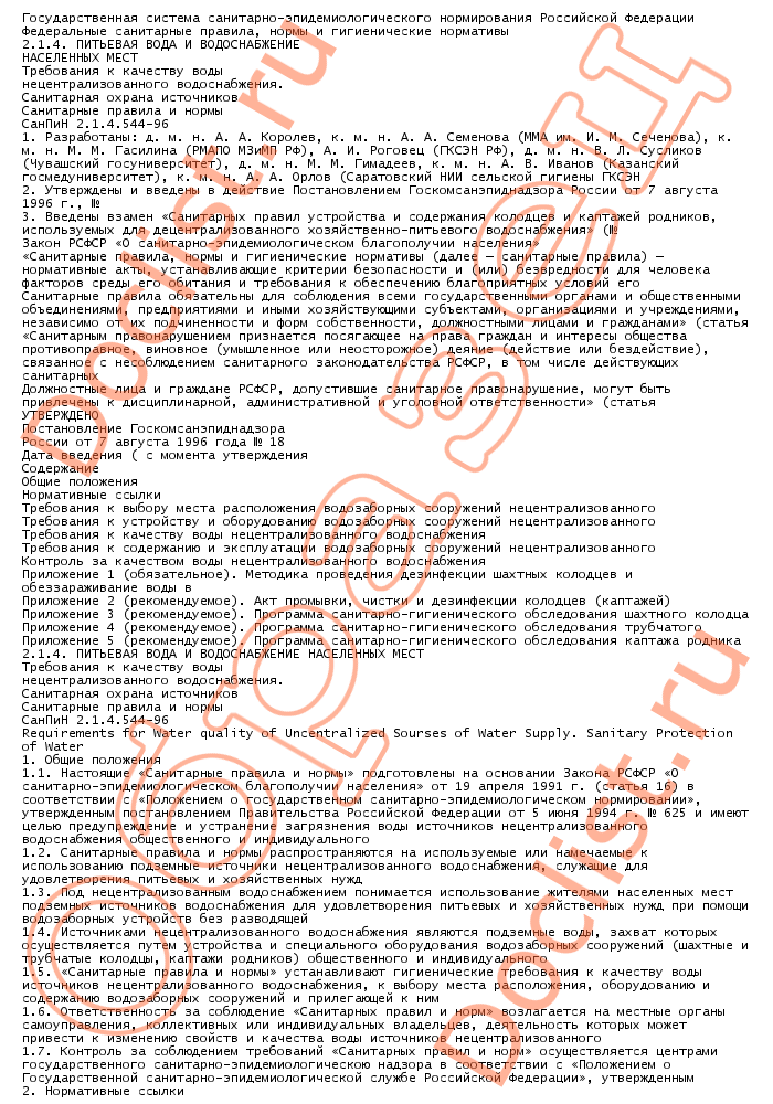 Главная :: Нормативы и стандарты :: Санитарно-эпидемиологические правила и нормативы (СанПин) :: СанПин 2. 1. 4. 544-96 Требования к качеству воды нецентрализованного водоснабжения. Санитарная охрана источников