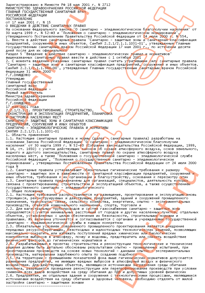 Главная :: Нормативы и стандарты :: Санитарно-эпидемиологические правила и нормативы (СанПин) :: САНПИН 2. 2. 1/2. 1. 1. 1031-01