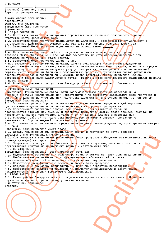 Заведующий бюро пропусков скачать образец должностной инструкции