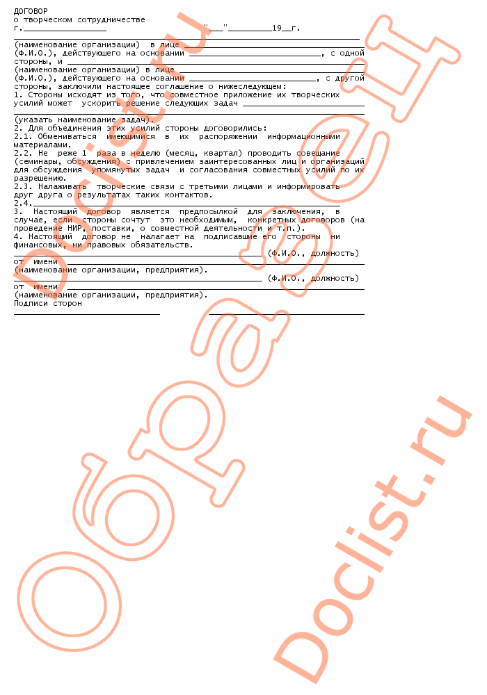 Главная :: Договоры :: Договор о совместной деятельности и сотрудничестве :: Договор о творческом сотрудничестве