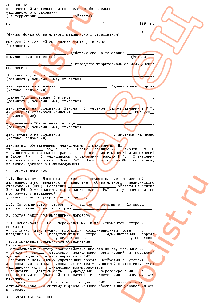 Образец договора о совместной деятельности по введению обязательного медицинского страхования (на территории области) скачать