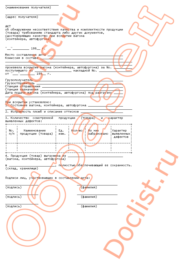 Образец акта об обнаружении несоответствия качества и комплектности продукции (товара) требованиям стандартов либо других документов, удостоверяющих качество при вскрытии вагона (контейнера, автофургона) скачать
