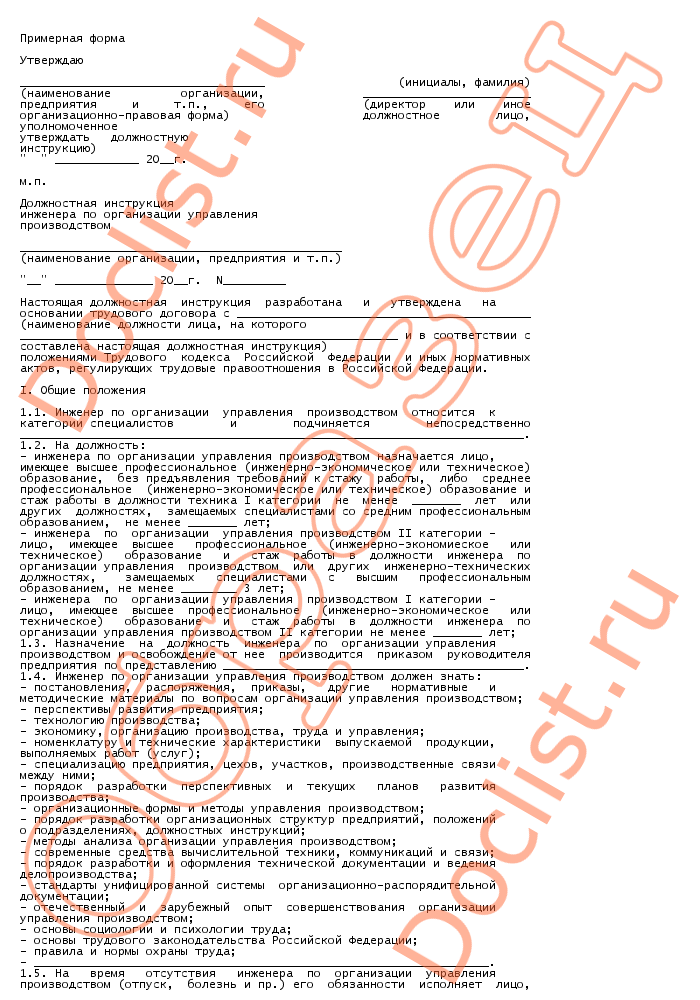 Главная :: Должностные инструкции :: Техническая служба :: Должностная инструкция инженера по организации управления производством