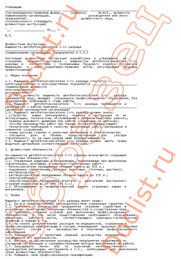 Должностная инструкция машиниста автобетоносмесителя 3-го разряда скачать образец