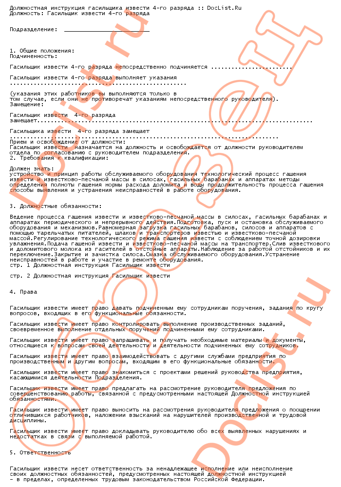Должностная инструкция гасильщика извести 4-го разряда скачать образец