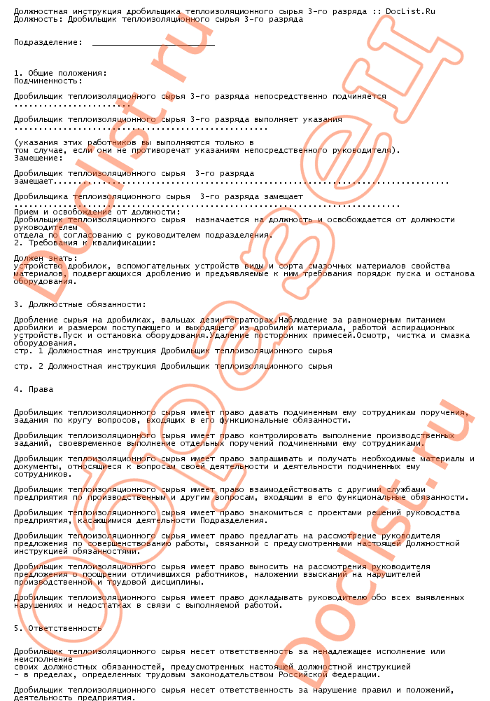 Должностная инструкция дробильщика теплоизоляционного сырья 3-го разряда скачать образец