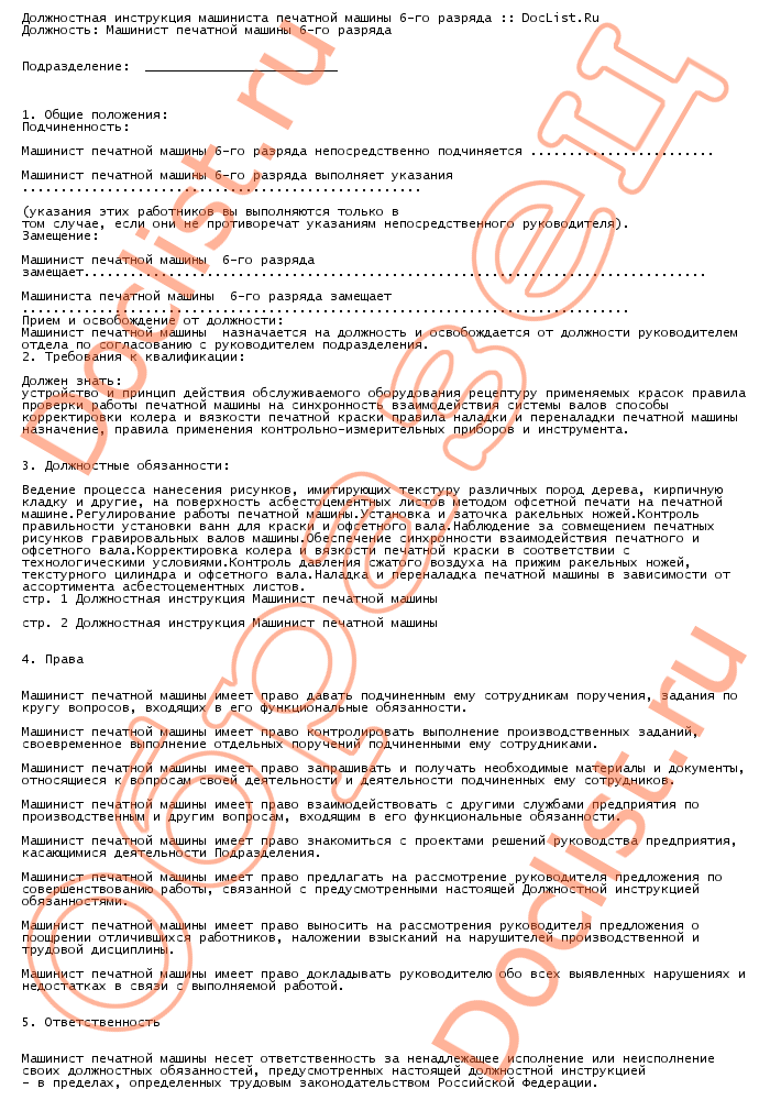 Должностная инструкция машиниста печатной машины 6-го разряда скачать образец