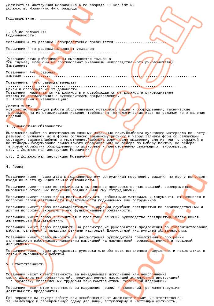 Должностная инструкция мозаичника 4-го разряда скачать образец