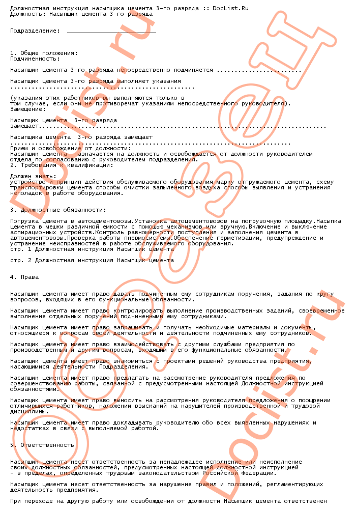 Должностная инструкция насыпщика цемента 3-го разряда скачать образец