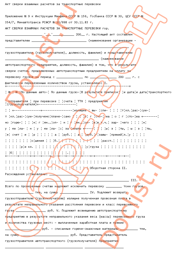 Акт сверки взаимных расчетов за транспортные перевозки скачать образец документа