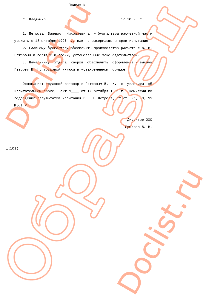 Приказ об увольнении в связи с тем, что не выдержан срок испытания скачать образец документа