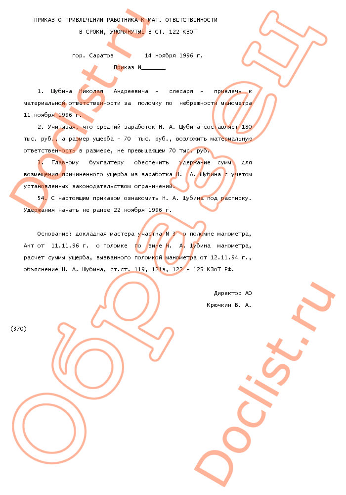 Приказ о привлечении работника к мат. ответственности скачать образец документа