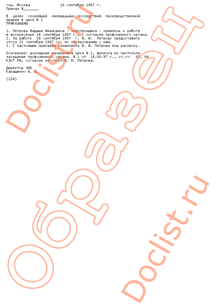 Приказ о привлечении к работе в выходной день с согласия профсоюзного органа скачать образец документа