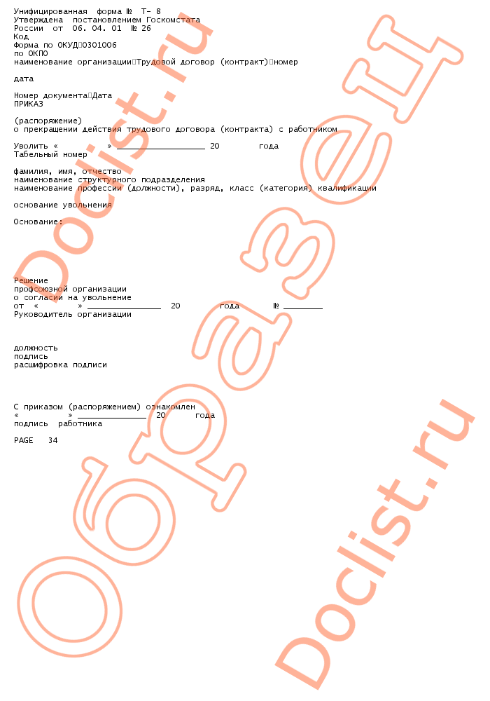 Приказ (распоряжение) о прекращении действия трудового договора (контракта) с работником (по форме Т-8) скачать образец документа