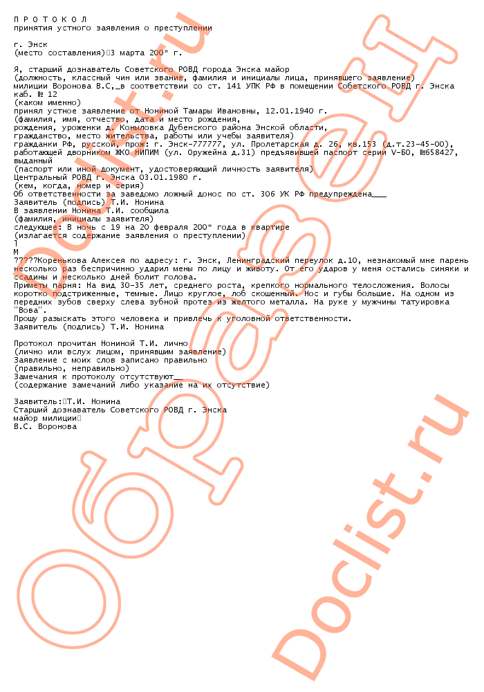 Протокол устного заявления гражданина о преступлении скачать образец документа