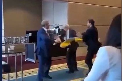 В сети появились кадры нападения на секретаря российской делегации, участвующей в заседании Парламентской ассамблеи Черноморского экономического сотрудничества (ПАЧЭС), Валерия Ставицкого. На записи видно, как российский делегат вырывает флаг из рук украинского депутата, а он в ответ начинает драку. |